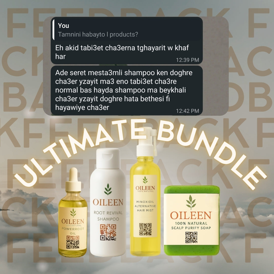 معًا، تستهدف هذه المنتجات الأربعة القوية كل مراحل صحة الشعر: تنظيف، تطهير، تغذية، وإعادة نمو. آمنة، فعّالة، وخالية ١٠٠% من المواد الكيميائية، هذه الباقة هي الحل المتكامل لشعر أكثف، أمتلأ، وأكثر ثقة—بشكل طبيعي